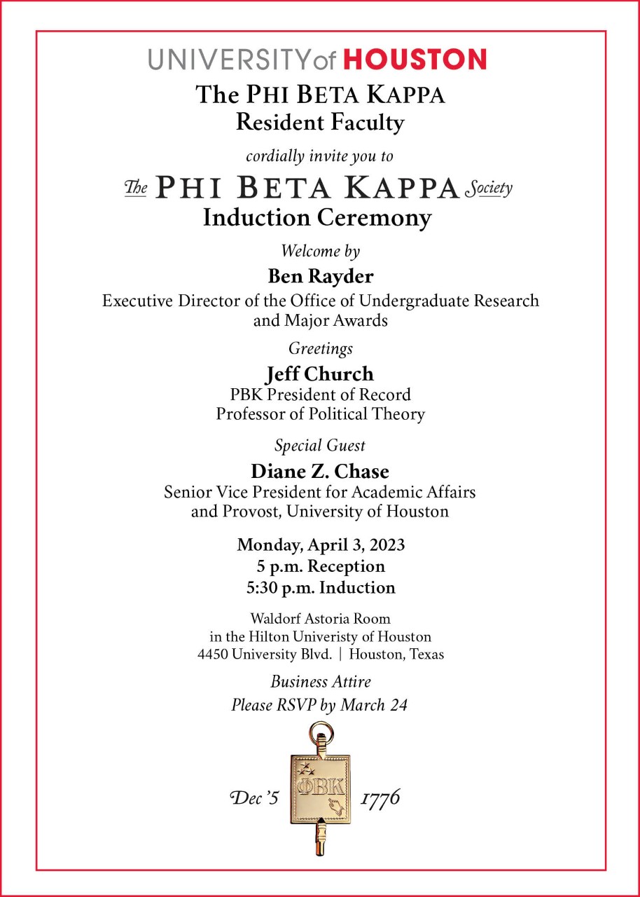 Since its founding in 1776, Phi Beta Kappa, the nation’s oldest and most prestigious honor society, has celebrated excellence in the liberal arts and sciences and championed freedom of thought. PBK recognizes the best and brightest liberal arts and sciences undergraduates and grants lifelong membership through a highly competitive selection process. The Mu of Texas chapter, PBK’s 284th, was installed on March 4, 2016, at the University of Houston.