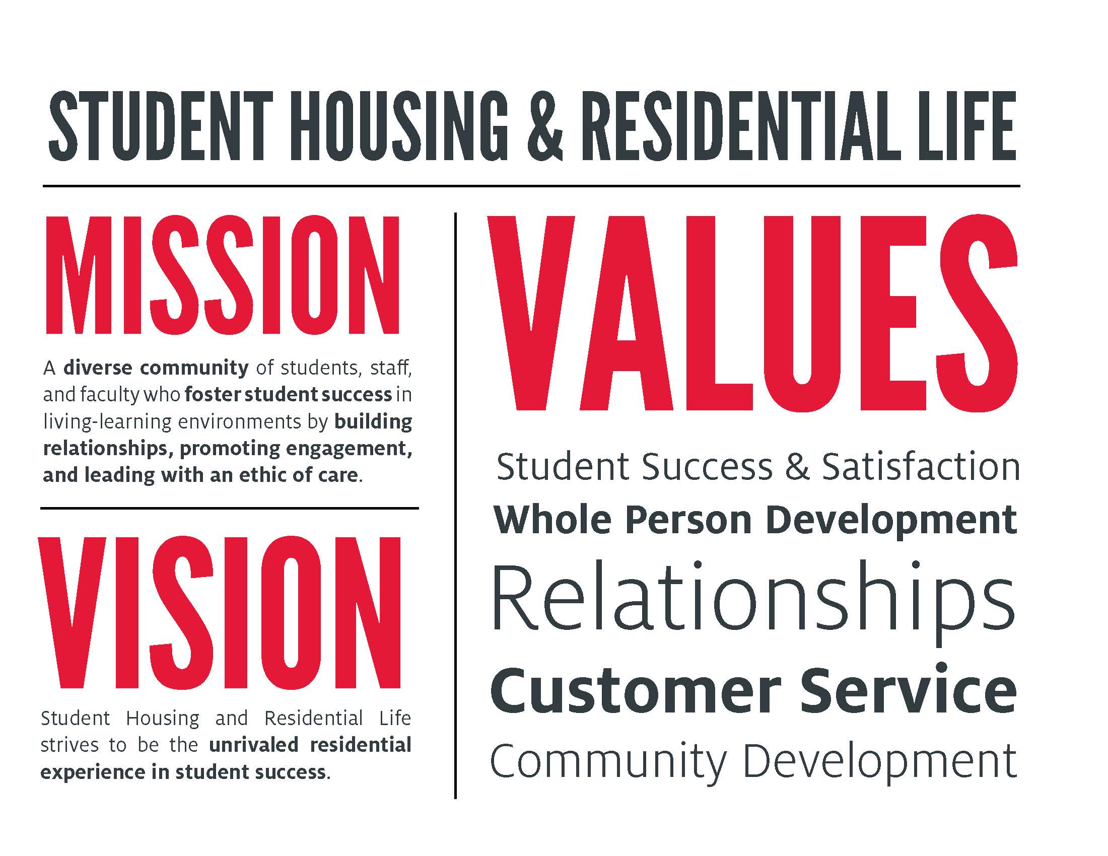 A diverse community of students, staff, and faculty who foster student success in living-learning environments by building relationships, promoting engagement, and leading with an ethic of care.