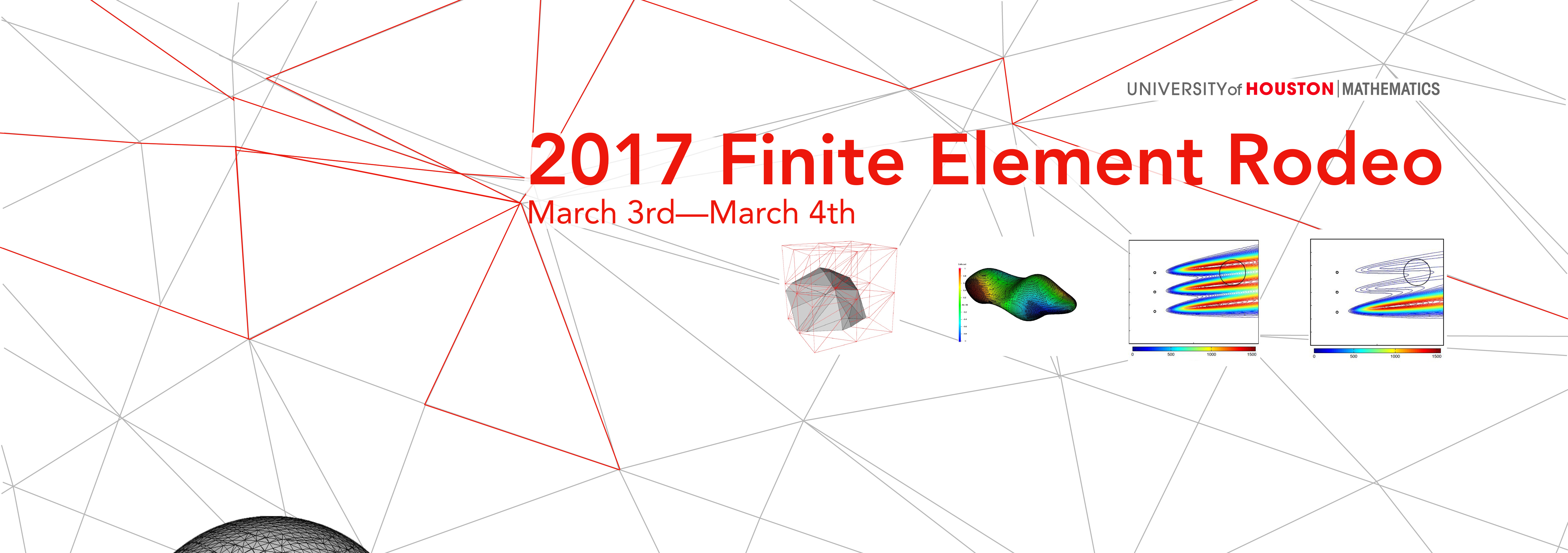 The 2017 edition of the Finite Element Rodeo will be held at the University of Houston on Friday and Saturday,  March 3—4, 2017, beginning early afternoon on Friday and ending mid-afternoon on Saturday.