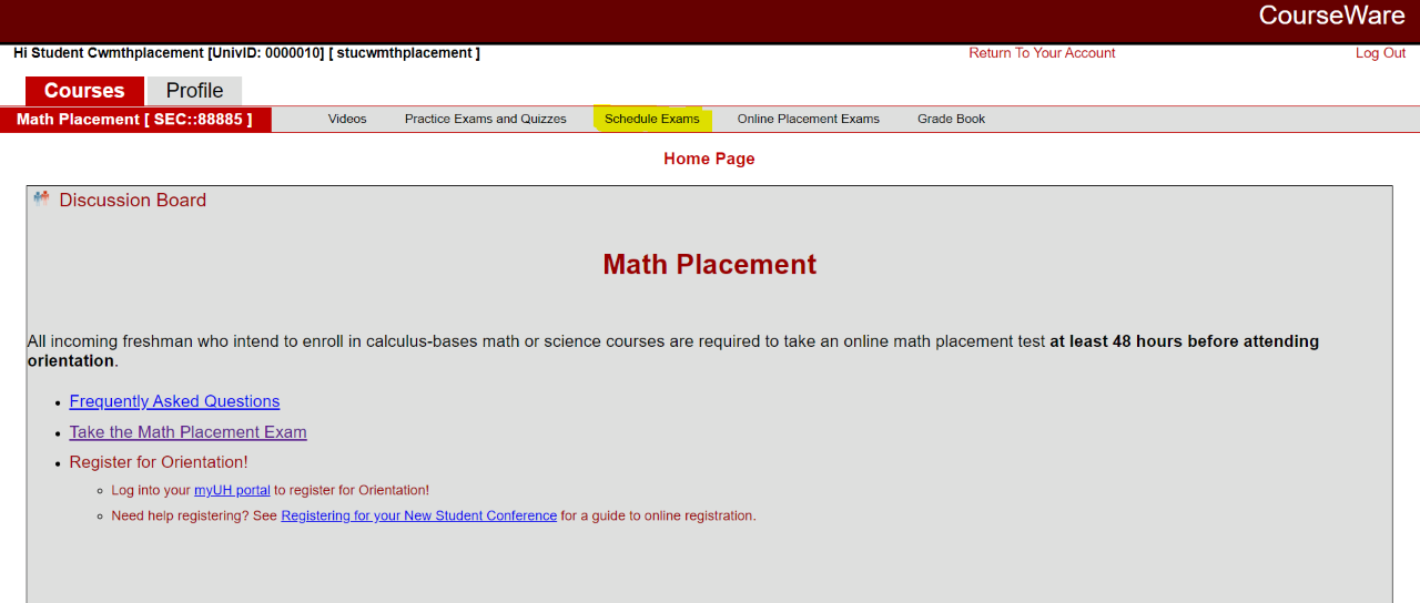 A. Please wait 24 hours and try again. If the same error occurs send an email to courseware@uh.edu with the subject line “Unable to access the math placement test.” In your email, please include the following information: